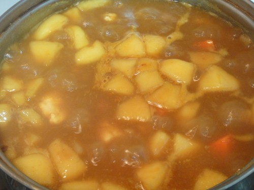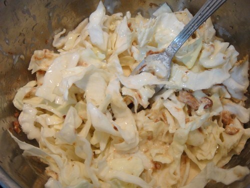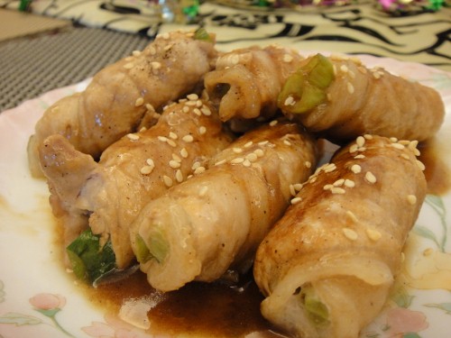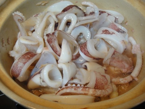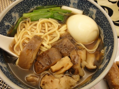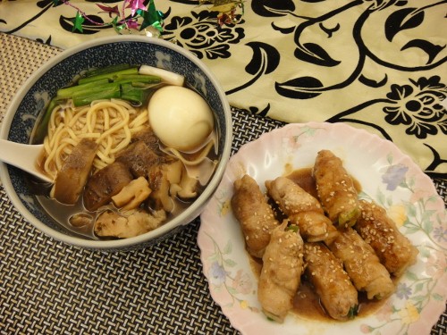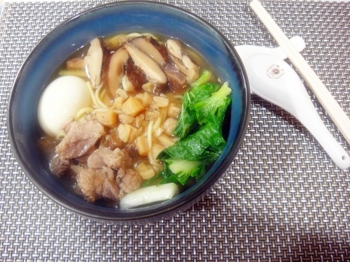 選的肉是豬腱子肉,用了蒜末、胡椒粉和醬油醃過,入鍋前再裹上太白粉,肉就會很嫩了,麵吸收了干貝、香菇的香,再加上青菜和一顆水煮蛋,很豐盛吧!這是我和JASON的晚餐